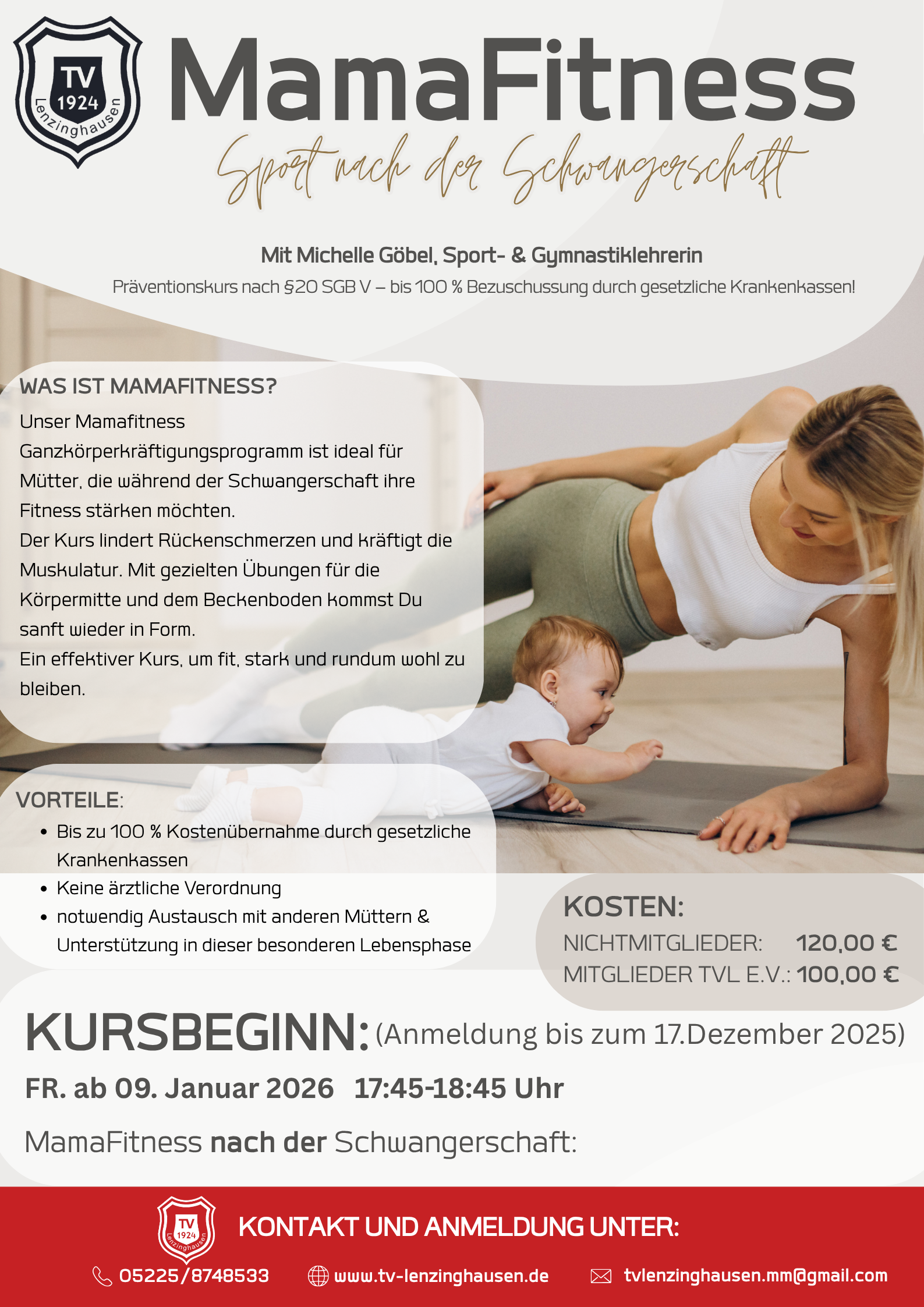 Unser zertifizierter Präventionskurs „Mamafitness – Ganzkörperkräftigung“ wurde von der Zentralen Prüfstelle für Prävention anerkannt und kann von deiner gesetzlichen Krankenkasse mit bis zu 100 % bezuschusst werden.